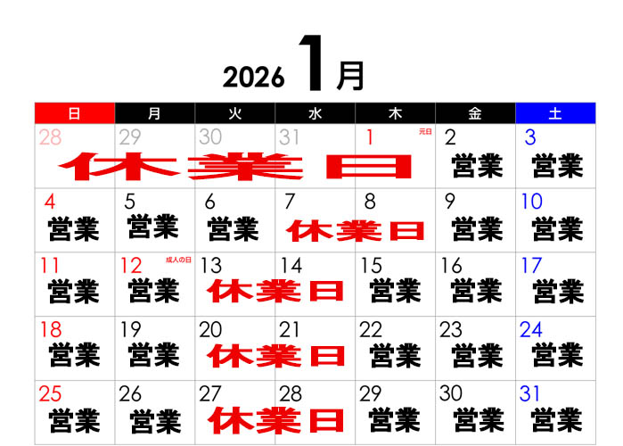 | [お知らせ] イベント等で営業日、営業時間が変更される場合がありますのでご了承下さい。 【営業時刻変更】 1月15日(木)は設備点検の為、15:30からの営業となります (営業開始時刻は前後する場合があります) 【1月休業日】 1月 1日(木) 1月 7日(水)、 8日(木) 1月13日(火)、14日(水) 1月20日(火)、21日(水) 1月27日(火)、28日(水) ![]() ●変更がある場合はホームページでその都度お知らせいたします |