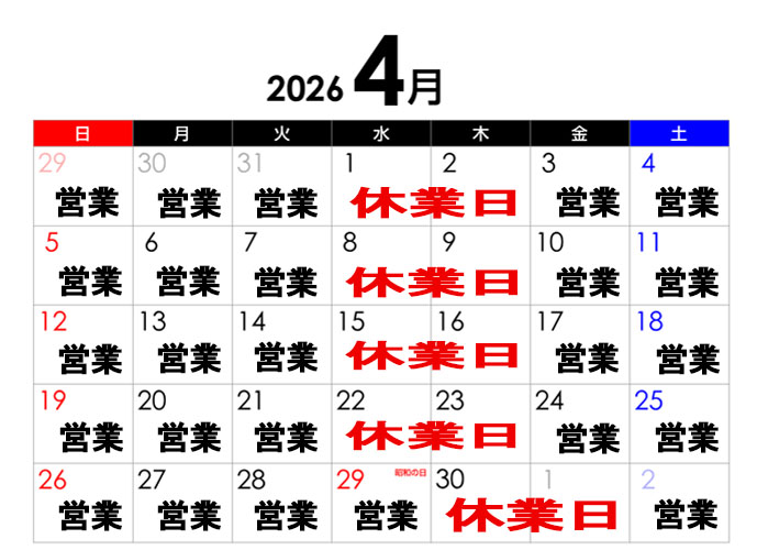 | [お知らせ] イベント等で営業日、営業時間が変更される場合がありますのでご了承下さい。 【3月休業日】 3月25日(水) 【4月休業日】 4月 1日(水)、 2日(木) 4月 8日(水)、 9日(木) 4月15日(水)、16日(木) 4月22日(水)、23日(木) 4月30日(木) 5月 1日(金) ![]() ![]() ●変更がある場合はホームページでその都度お知らせいたします |