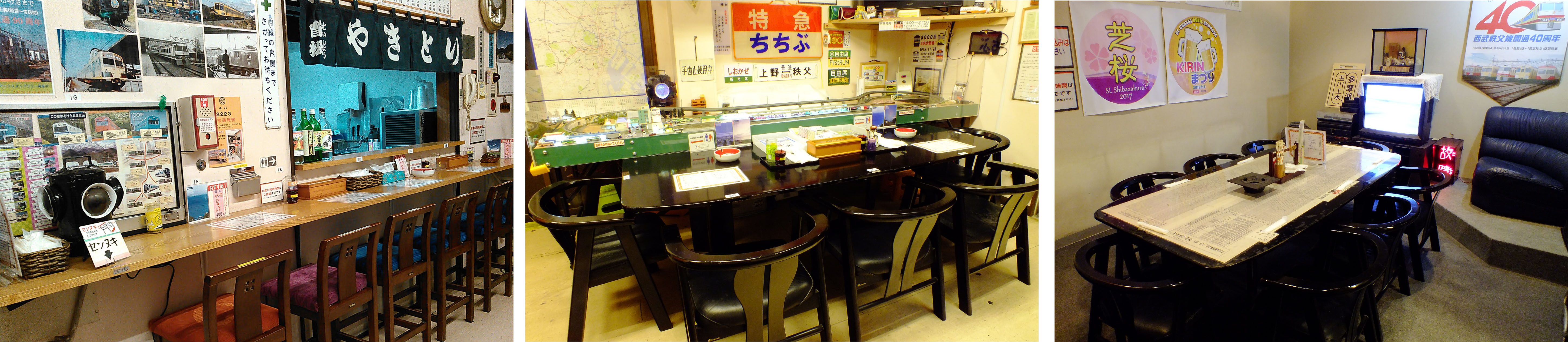 | 【カウンター席】 | 【テーブル席(鉄道ジオラマ)】 模型車両をお持ちいただいての 運転は行っていません |