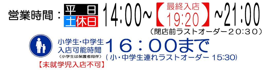 | 【利用のご案内】 店内の利用時間は2時間です(席利用のラストオーダー1時間30分) 1グループで入店できる人数は8名までです(ご予約の場合も含む) 8名以内でも座席の利用状況によりお断りする場合があります 【ご注意】中学生以下は原則16時以降入店できません 小学生はお子様だけでは入店できません 未就学のお子様は終日入店できません 【ご予約について】 ご予約はご利用日の2週間前からとさせていただきます(12月3日を除く) ご予約時間から30分過ぎますとキャンセルとなりますのでご注意ください 営業日は下のお知らせをご覧ください 変更がある場合はホームページでその都度お知らせいたします。 |