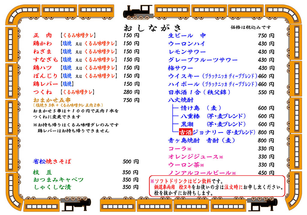 ![]() 土曜・休日 13:00〜14:00は予約で営業します(当日予約不可) ※※※ 焼き鳥が売切の場合は早じまいさせていただきます ※※※ |